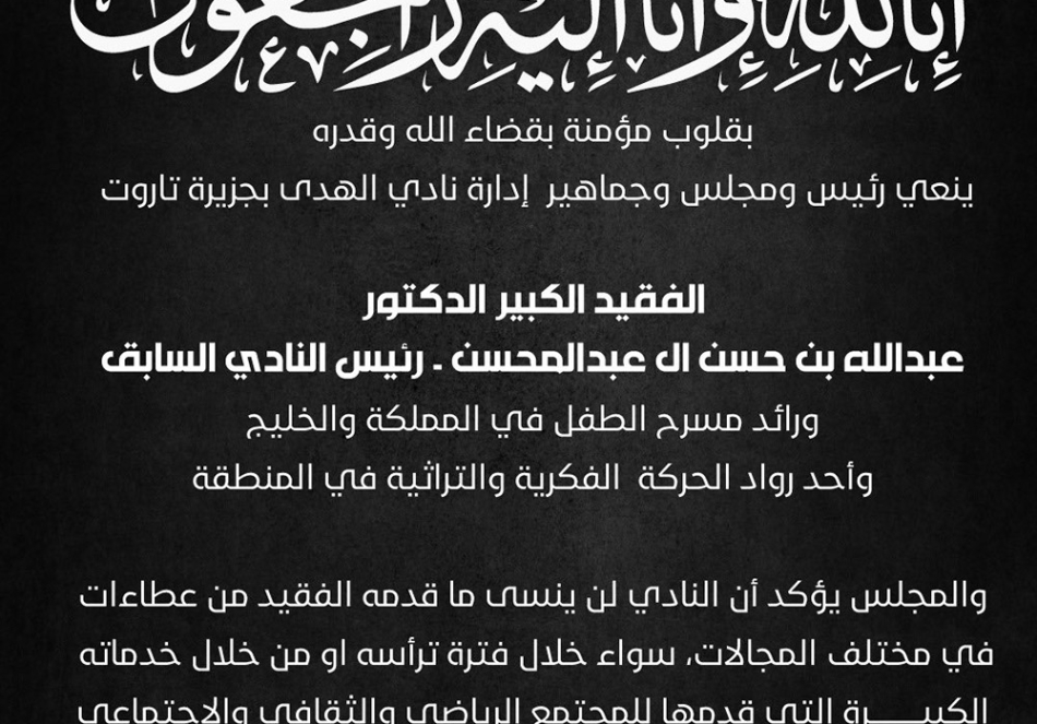 بقلوب مؤمنة بقضاء الله وقدره، ينعي رئيس ومجلس وجماهير إدارة نادي الهدى بجزيرة تاروت الفقيد الكبير الدكتور عبدالله بن حسن ال عبدالمحسن - رئيس النادي السابق - ورائد مسرح الطفل في المملكة والخليج، وأحد رواد الحركة الفكرية والتراثية في المنطقة.